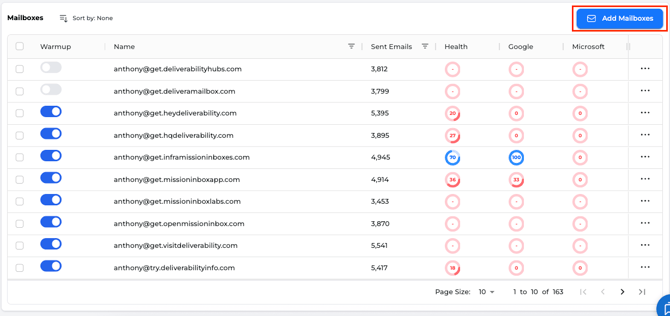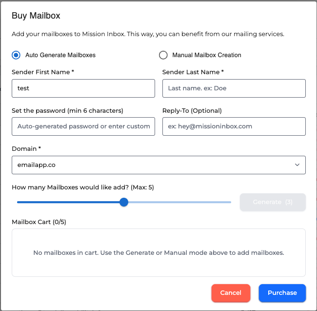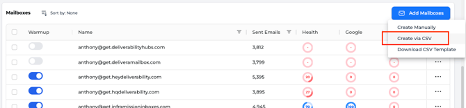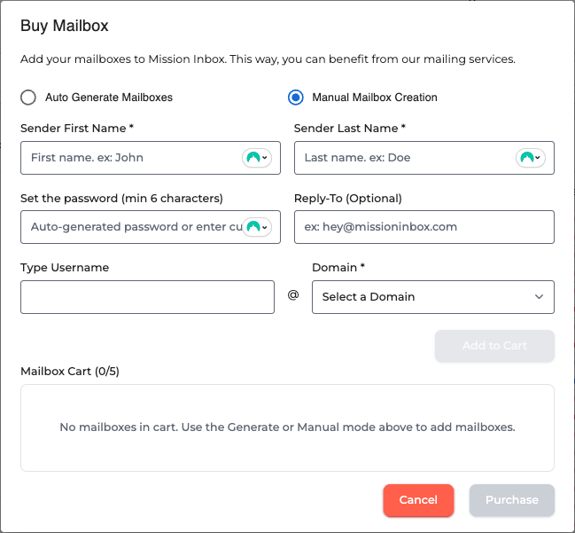 Setting up your mailboxes in Mission Inbox is quick and flexible. Whether you’re adding just a few or setting up hundreds at once, the platform gives you options to do it manually, auto-generate usernames, or bulk upload with a CSV file.